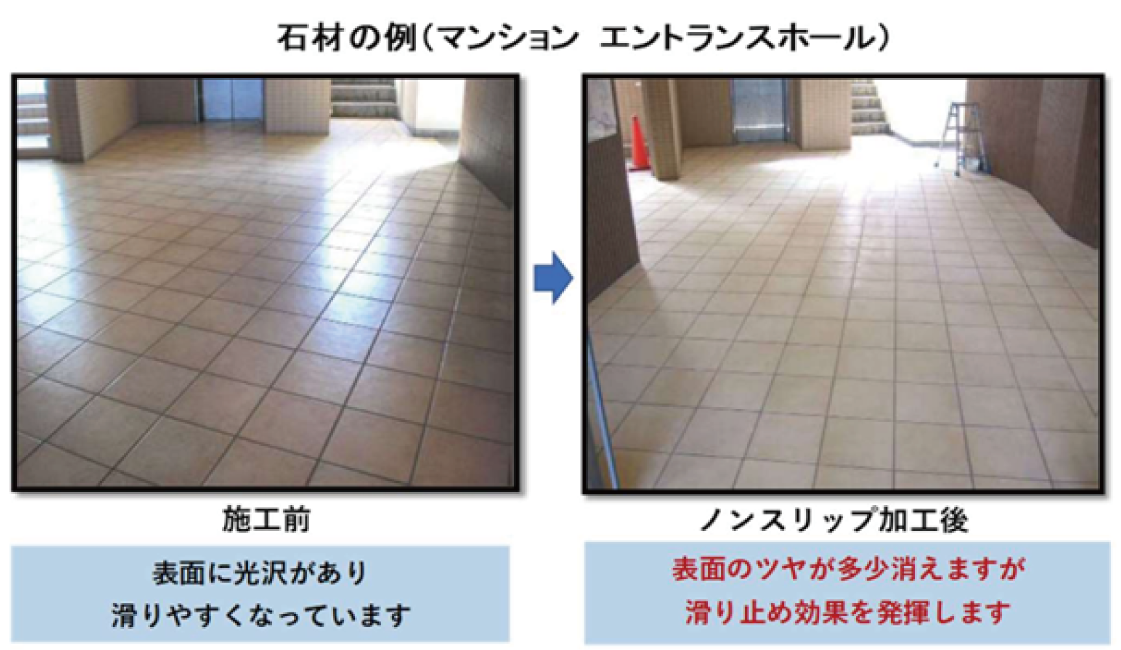 当マンションにおいては、オーナーから「エントランス床面が滑り住民が危険な状況になっている」という相談があり2011年に施工いたしました 。 当社ノンスリップ工法を施工することにより危険な状態を解決し、2022年においても安全な状態を 保っている事例となります。